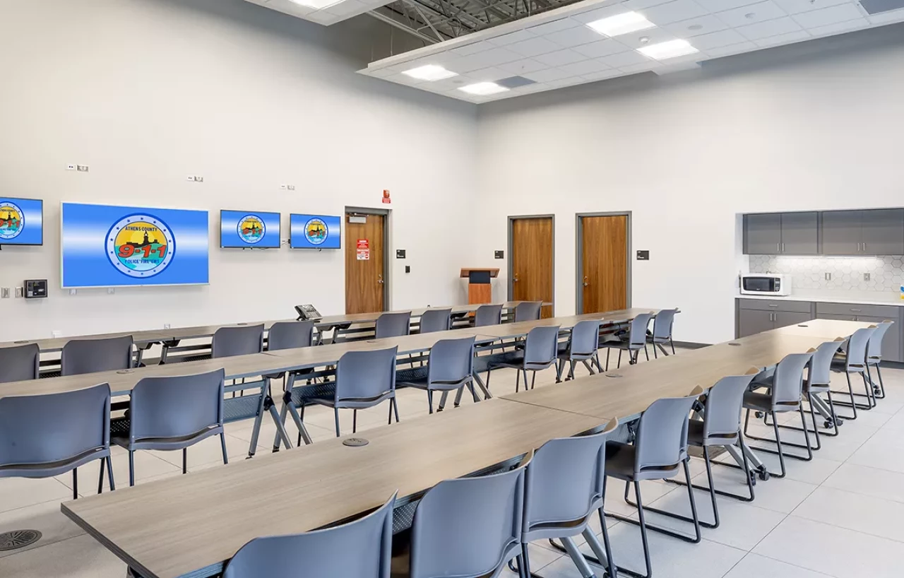 To properly accommodate this necessary growth and better serve the Southeastern Ohio Valley region, a new 10,590 SF single-story building with an occupancy load of 105 individuals was constructed on a separate site. Construction consisted of poured insulated concrete forms walls, CMU, steel, and masonry structure. A storm shelter was also included for 105 individuals in addition to one specific area for wheelchair accessibility. The facility now houses Athens County 911, EMA, a joint 911/EMA training facility, and administration offices for both agencies and other supporting functions, making it the second largest 911 call center in the State of Ohio.