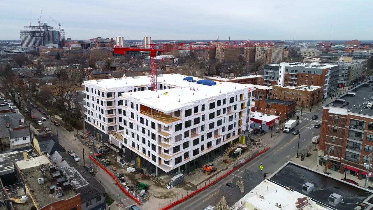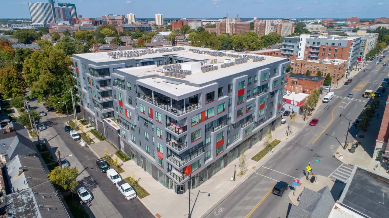 8th & High Apartments is a 180,000 SF building located on the NW corner of 8th and High Street near The Ohio State University. The structure includes 143 wood-framed apartments on five floors situated above a two-level, 46,000 SF parking garage and street-front amenities and retail space. Amenities include ground-level lounge areas and fitness center, an elevated courtyard deck with extensive hardscaping, and a rooftop clubhouse with a bar opening to an outdoor terrace with skyline views.