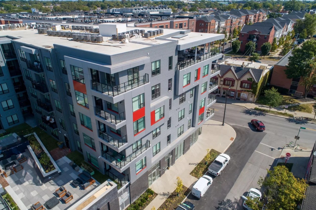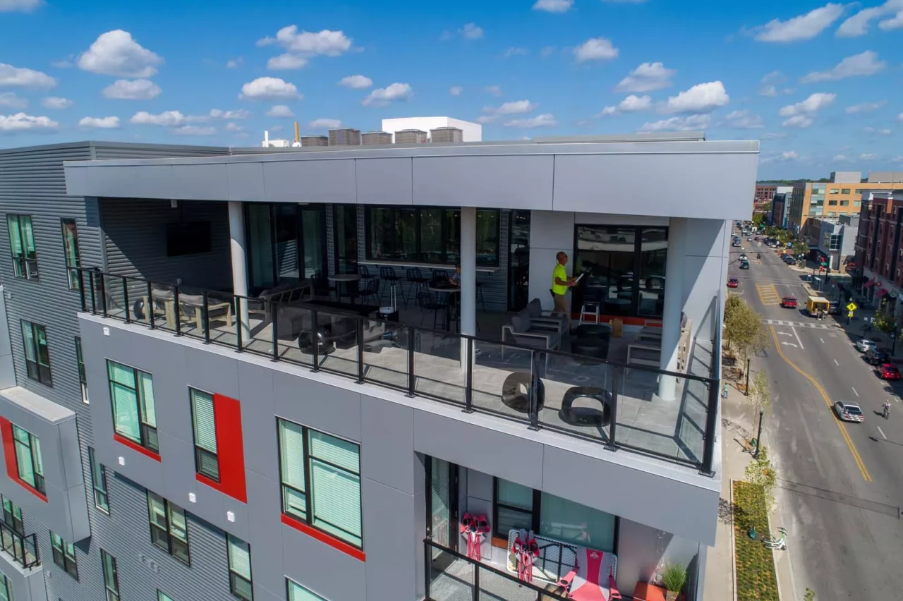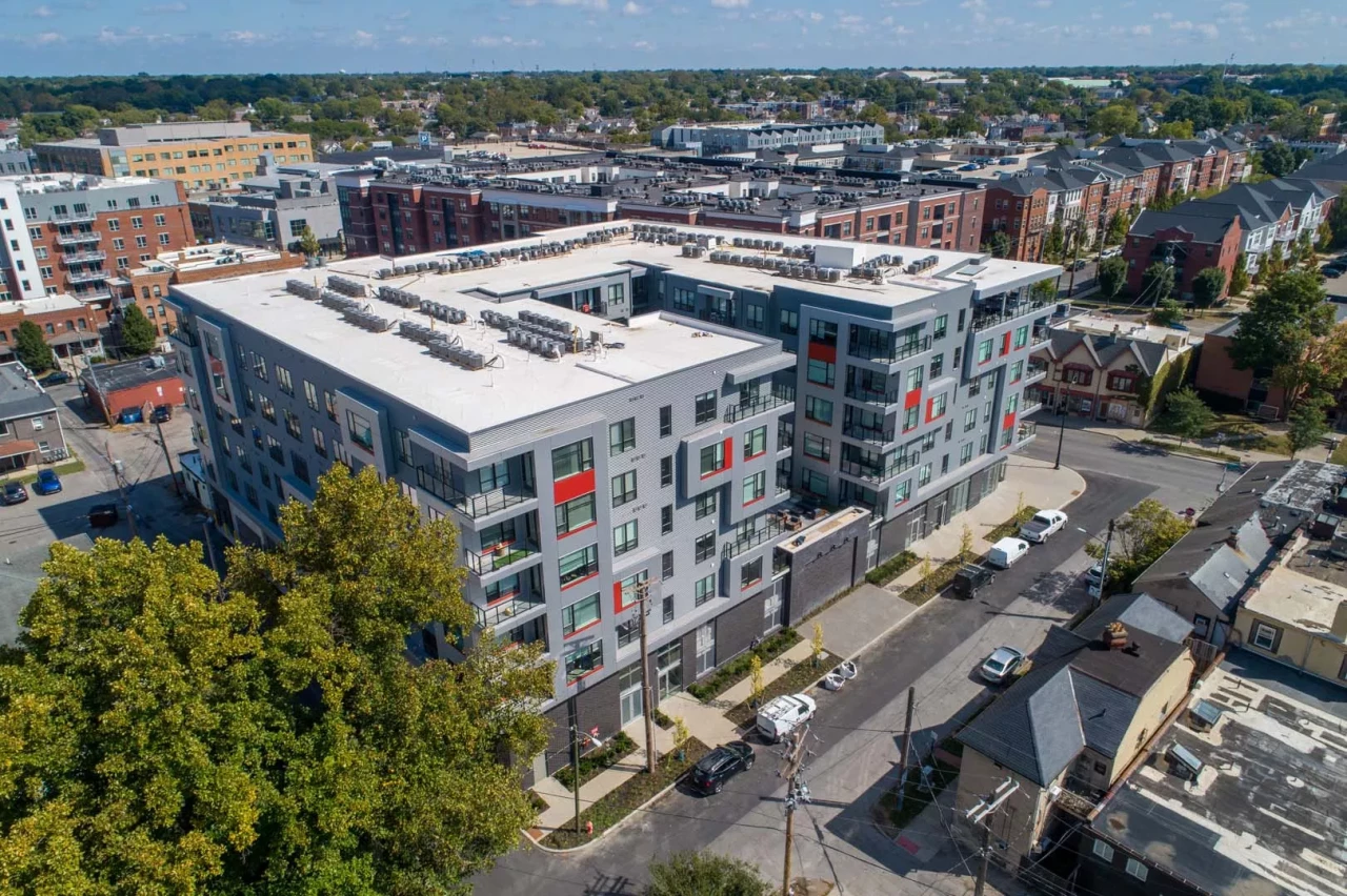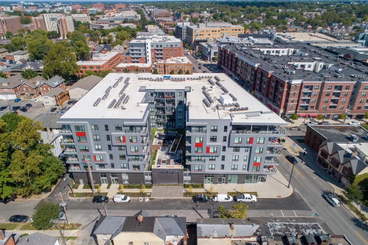 8th & High Apartments is a 180,000 SF building located on the NW corner of 8th and High Street near The Ohio State University. The structure includes 143 wood-framed apartments on five floors situated above a two-level, 46,000 SF parking garage and street-front amenities and retail space. Amenities include ground-level lounge areas and fitness center, an elevated courtyard deck with extensive hardscaping, and a rooftop clubhouse with a bar opening to an outdoor terrace with skyline views.
