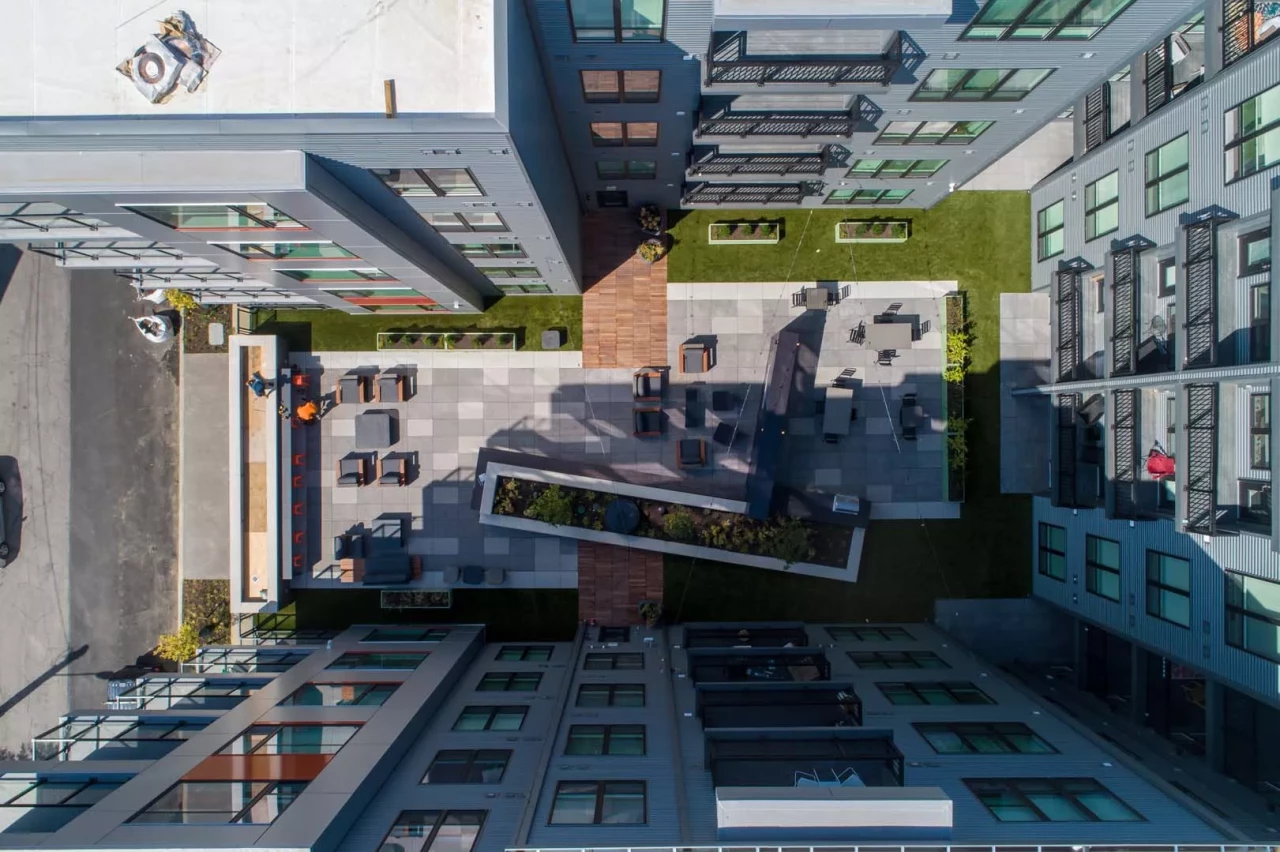 The structure includes 143 wood framed apartments on five floors situated above a two-level, 46,000 SF parking garage and street-front amenities and retail space.