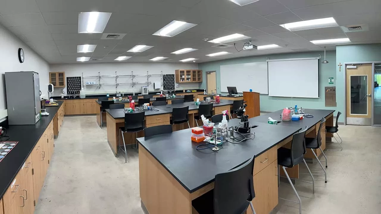 Belmont Abbey Project located in Belmont NC, is the interior renovation and redesign of an existing laboratory classroom, accessible washroom and installation of complete new fire alarm system including new devices and annunciator panels. Some of the challenges we face in this project are the safe removal and abatement of asbestos filled masonry units during demolition and the logistics of the installation of the fire alarm system in a finished active above ceiling work space with in a limited schedule.