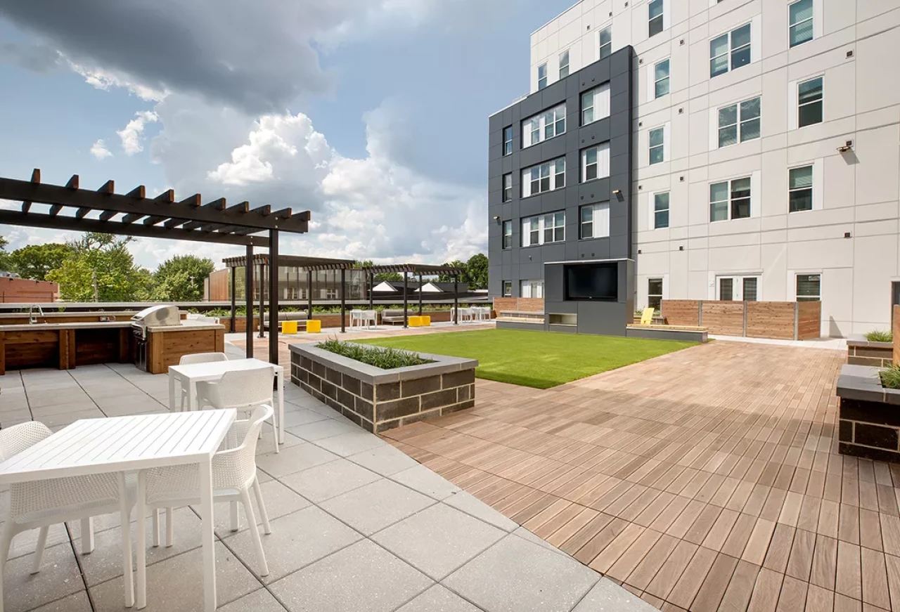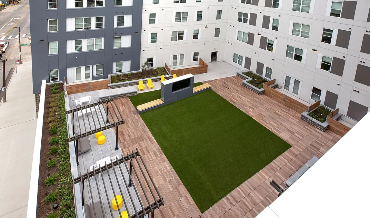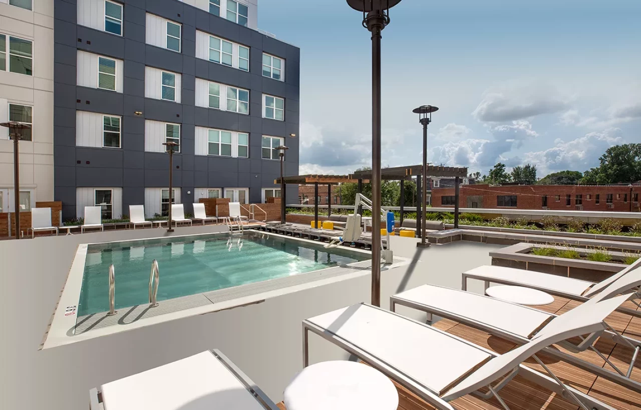 deck, housing pool and lounge areas. The first floor of the building offers retail space,