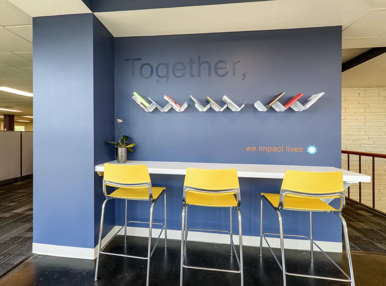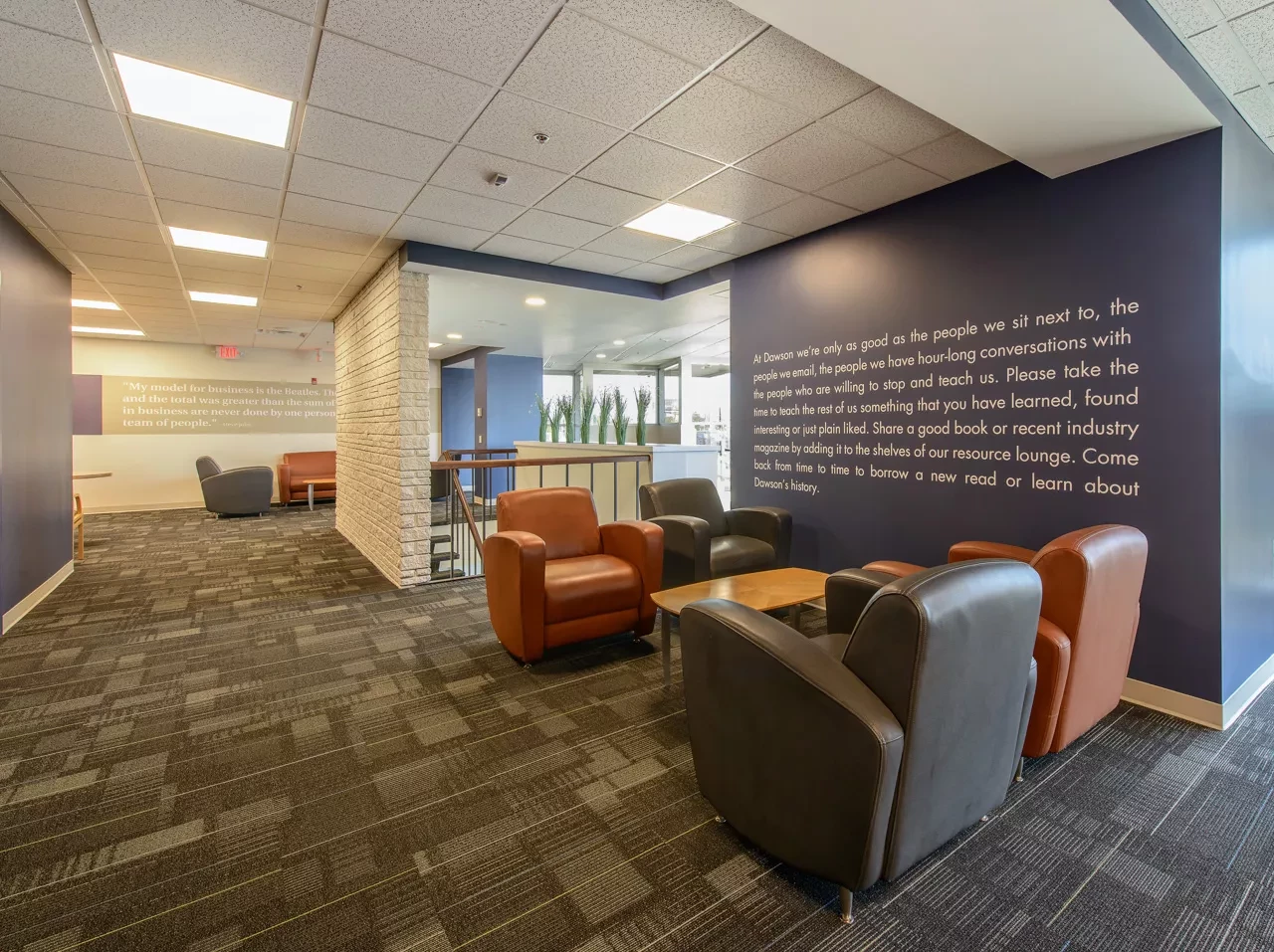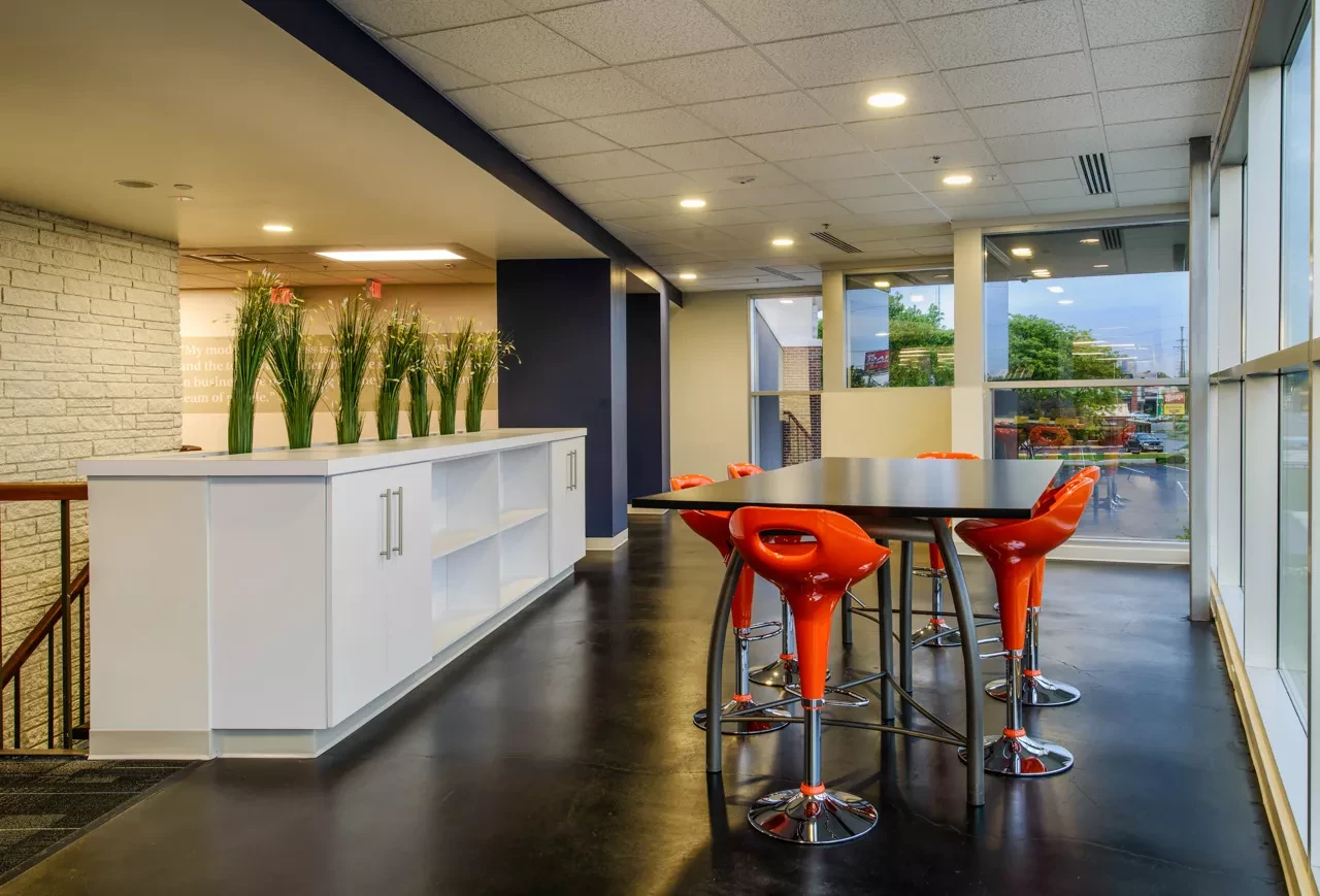 A 46,000 SF building renovation and office build-out in downtown Columbus, OH. The building was gutted and new mechanical, electrical and plumbing systems were installed including fire protection. The four-story building was renovated with new walls, painting, furnishings, bathrooms, entryway, floors, ceilings, and wiring for IT and multimedia televisions. The facility includes offices, cubicle space, conference rooms, workout facility, bathrooms, a multi-purpose room, employee café/kitchenette, ornamental glass and bronze staircase, storage space and multi-plane architectural woodwork. The exterior is decorated with a faux brick finish and decorational platforms. Space on the north side the building was renovated for future tenant build-out. This project used an eco-friendly design utilizing the latest technology for power savings by reducing number of light fixtures and the design provided for a large skylight and large glass pane in the building façade