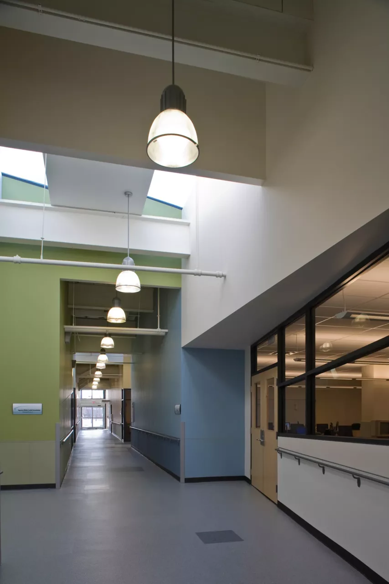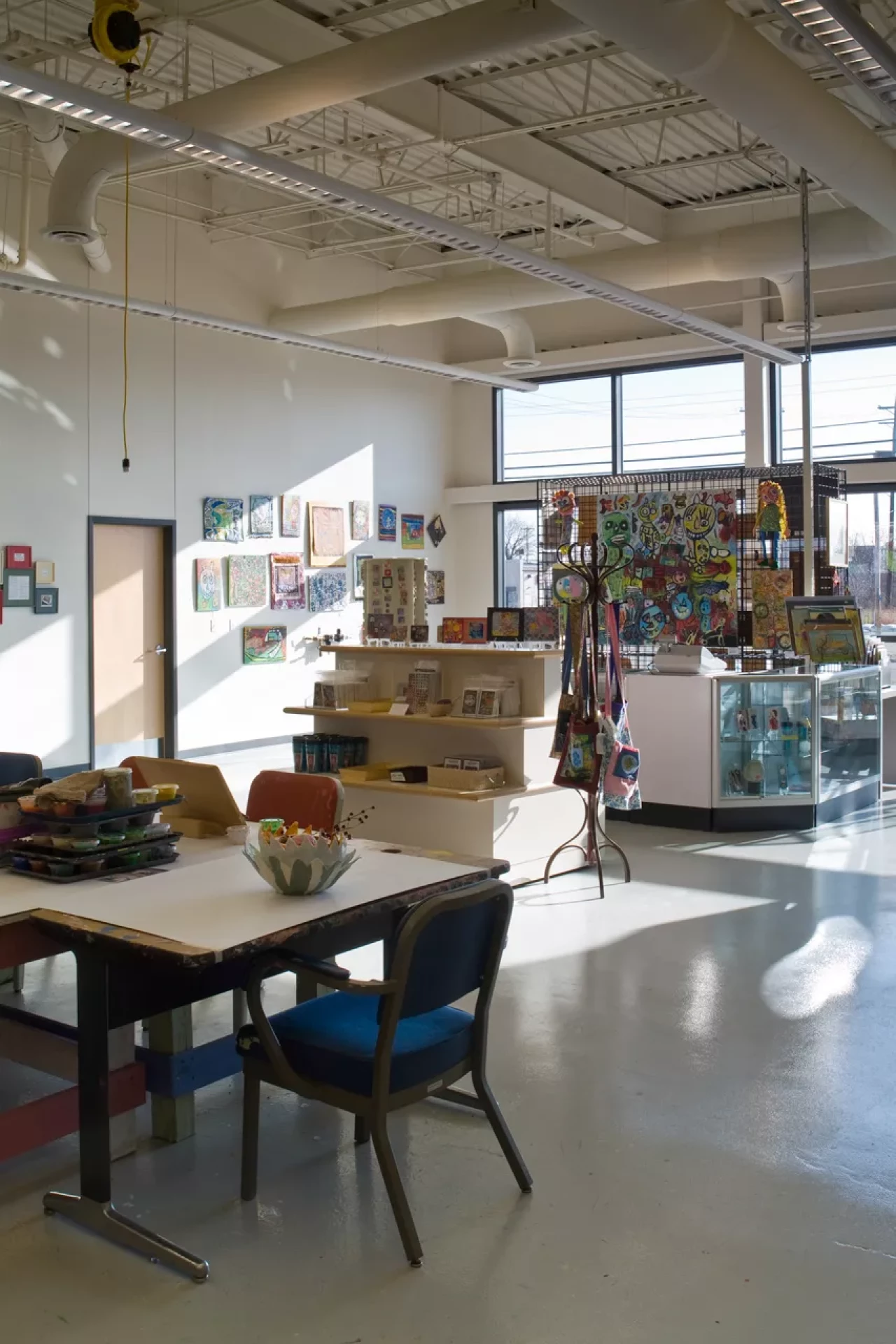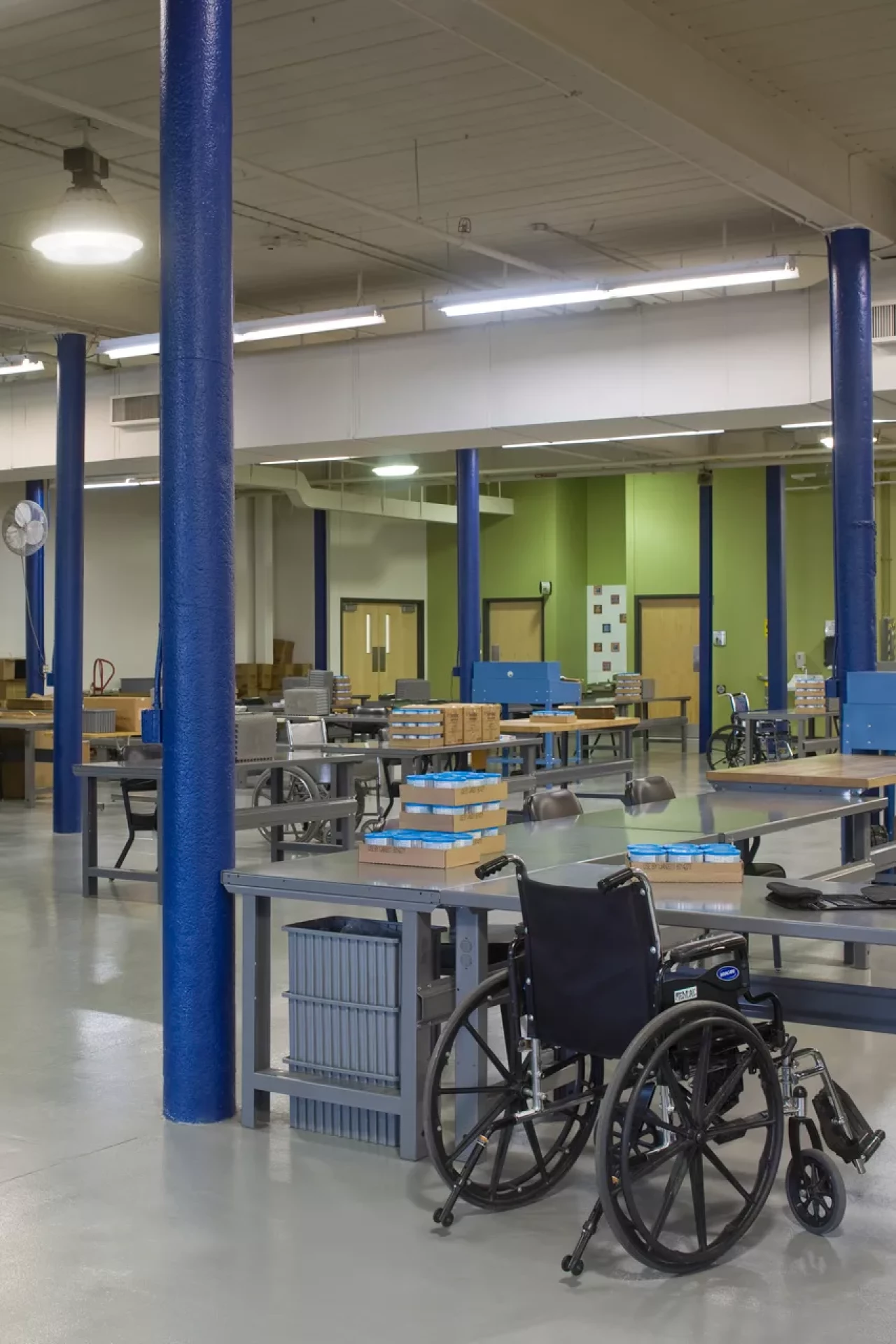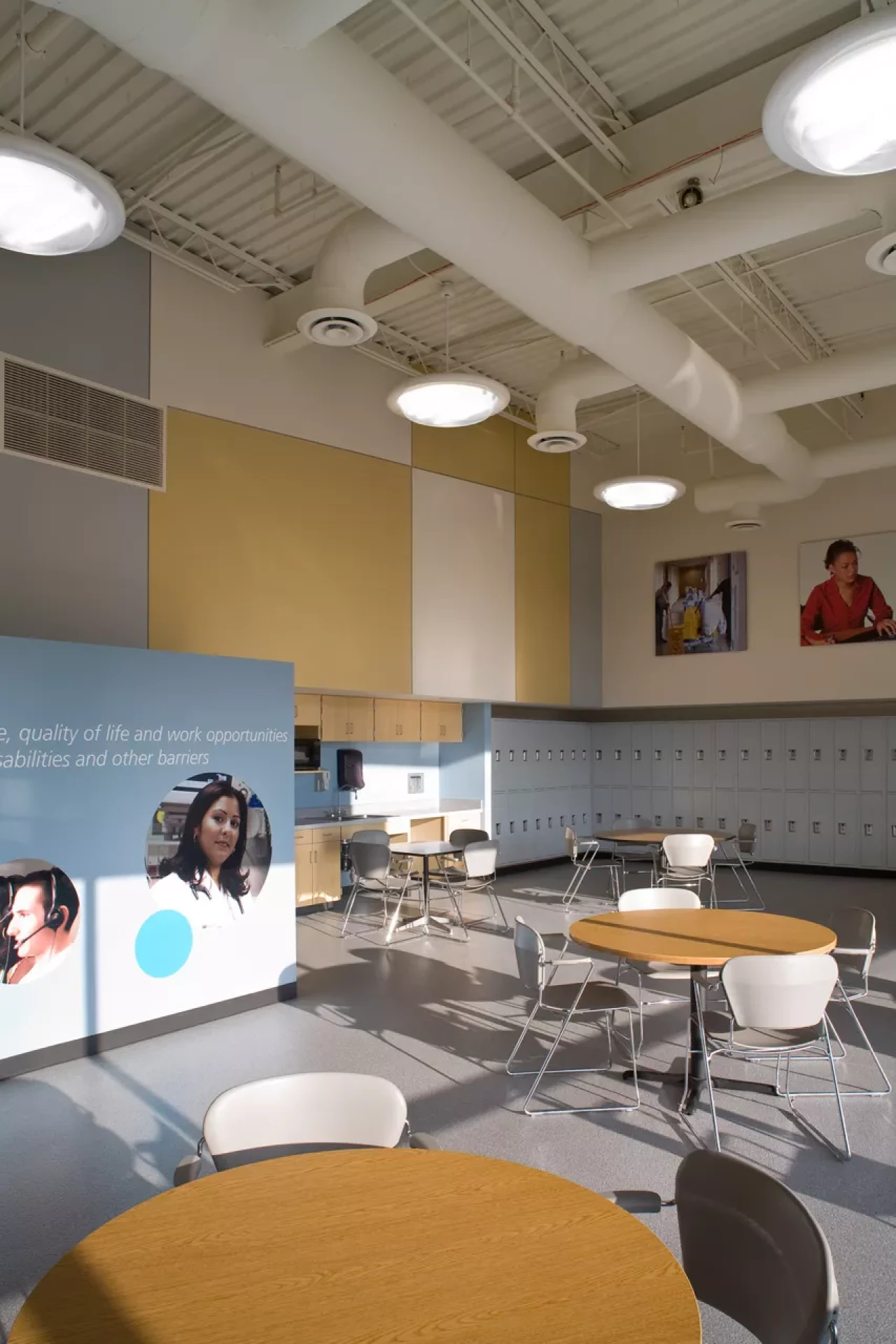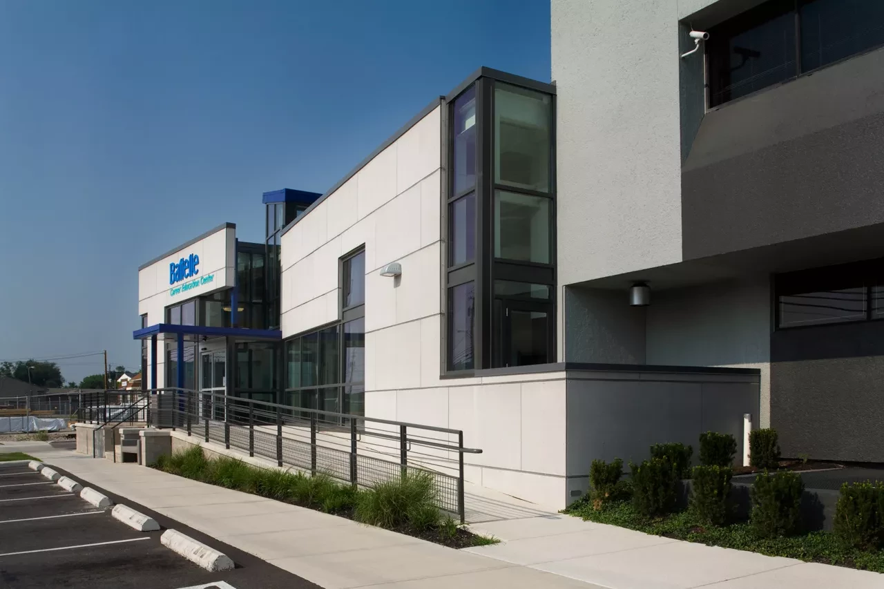 The renovation also included two adaptive exercise rooms for use by program participants and employees, an art studio and gallery, work assembly and fulfillment space, multipurpose rooms, and administrative, finance, program, and management offices. Extensive modifications were made to the structure in the Battelle Career Education Center. Design elements include a cement panel rain screen wall system, EPDM roofing, retrofitted skylight systems, glass curtain wall system, painted CMU walls, drywall partitions, new electrical gear, new roof top units, non-slip vinyl flooring, epoxy flooring, and carpet. Exterior ramps contain ice melt systems.