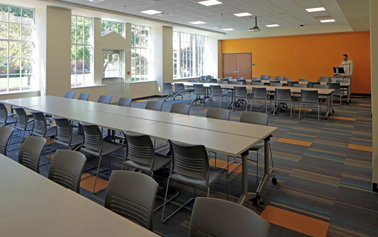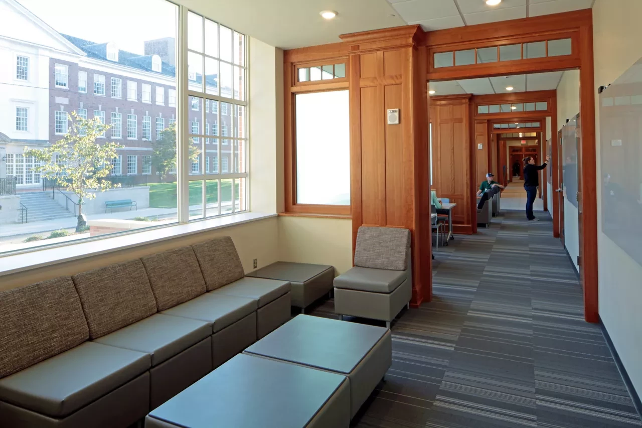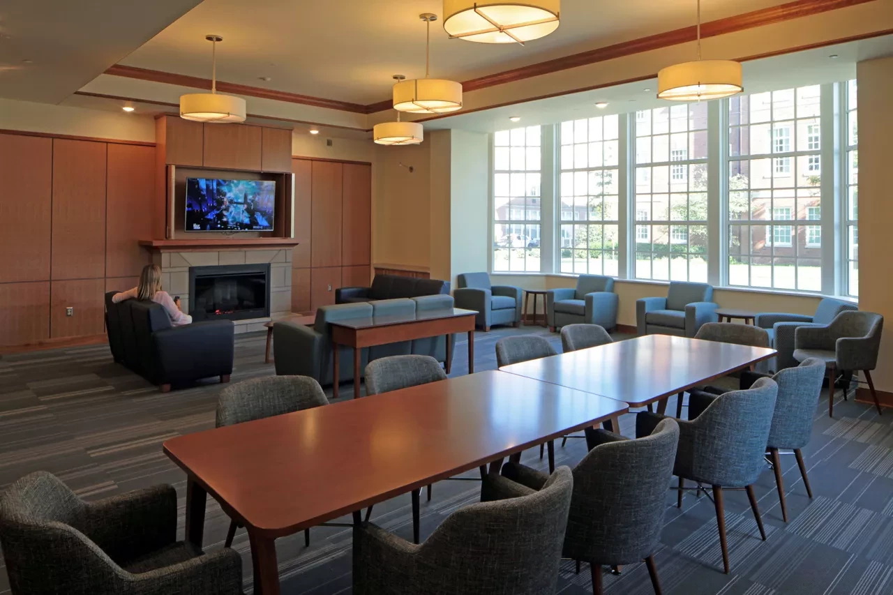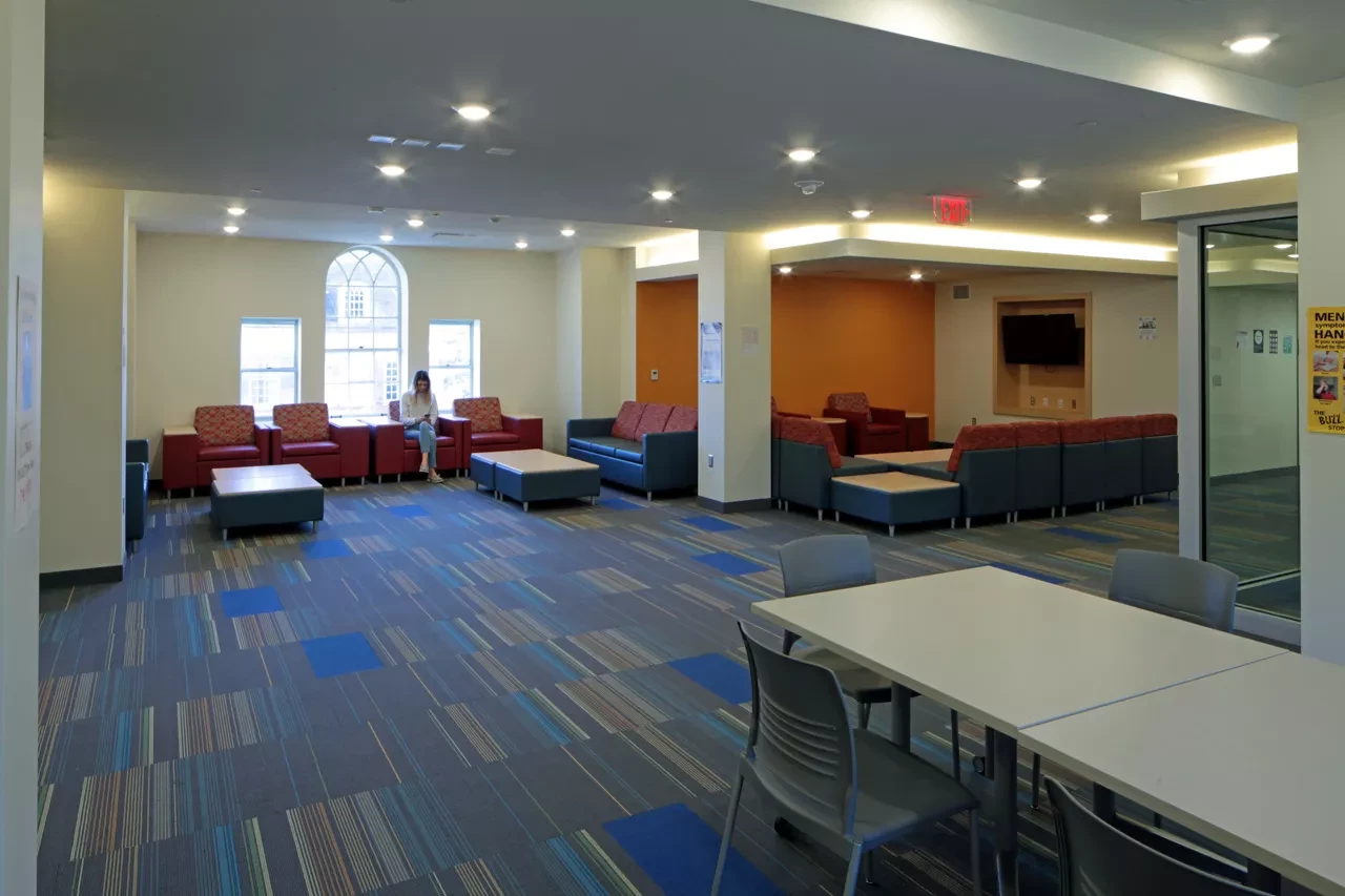 Major mechanical and electrical systems were moved out of the basement-level garage (approx. 44,000 GSF) for upgrades to new energy efficient systems. The residence hall (approx. 80,000 GSF) upgraded resident rooms with living/learning community components including open lounges and community spaces. The existing dining hall (approx. 16,000 GSF) was reconfigured and renovated as a modern and vibrant culinary experience with a Café and Marketplace designed to serve students and faculty.