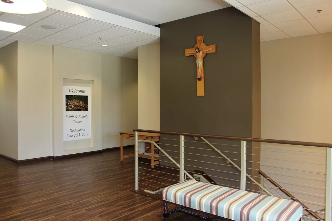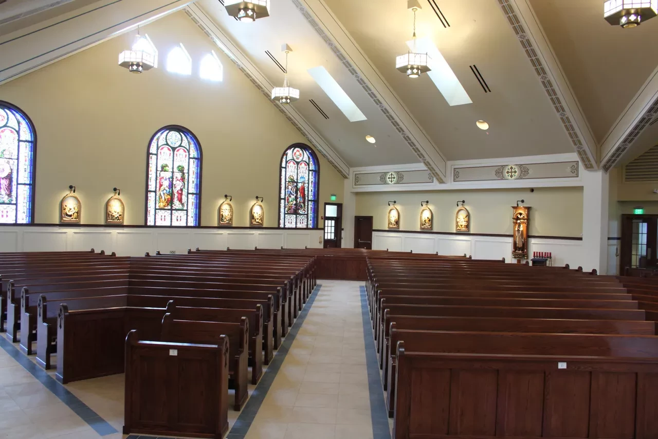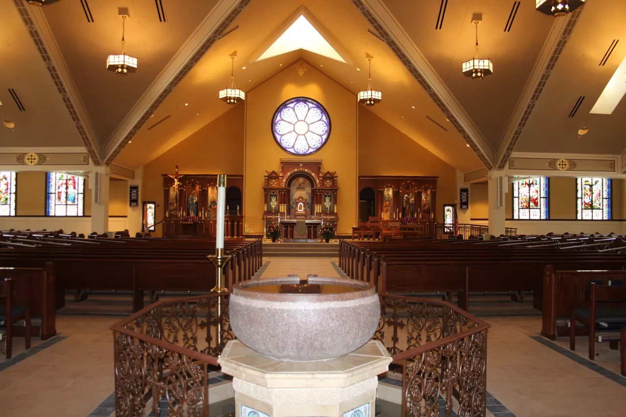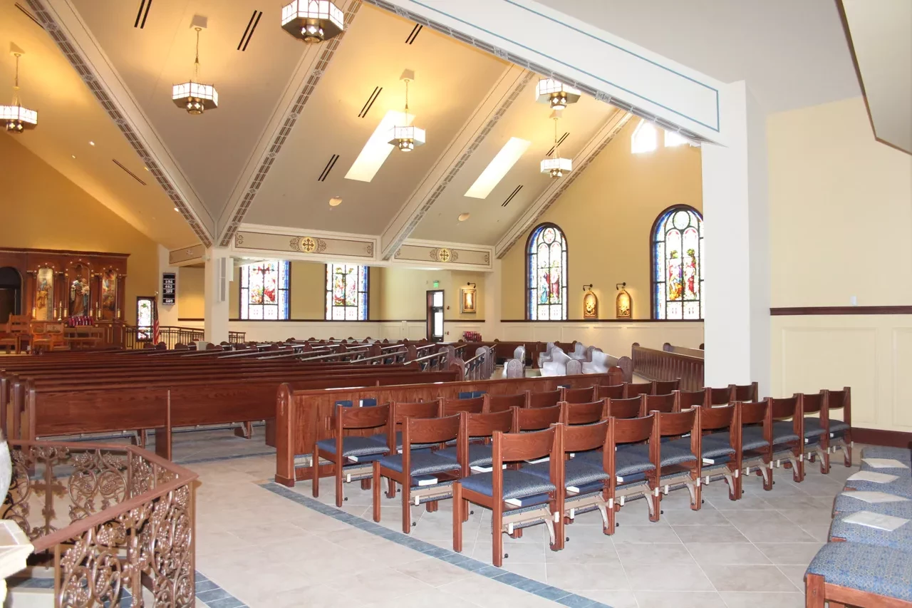 New Sanctuary The new Sanctuary seats 550 and was designed for future expansion (1,100 seats). A new connector unit between the Parish offices and Faith & Family Center was also built. Elford performed the following work: sanitary & storm system upgrades; remediation of the east parking lot; adding new St. Ladislaus windows; reconstruction and renovation of the altar of repose; tile flooring; a baptismal font; larger HVAC units; new retractable hanging lights; additional catwalks in the attic; relocation of the power transformer; installation of a back-up generator; and additional A/V equipment installation.