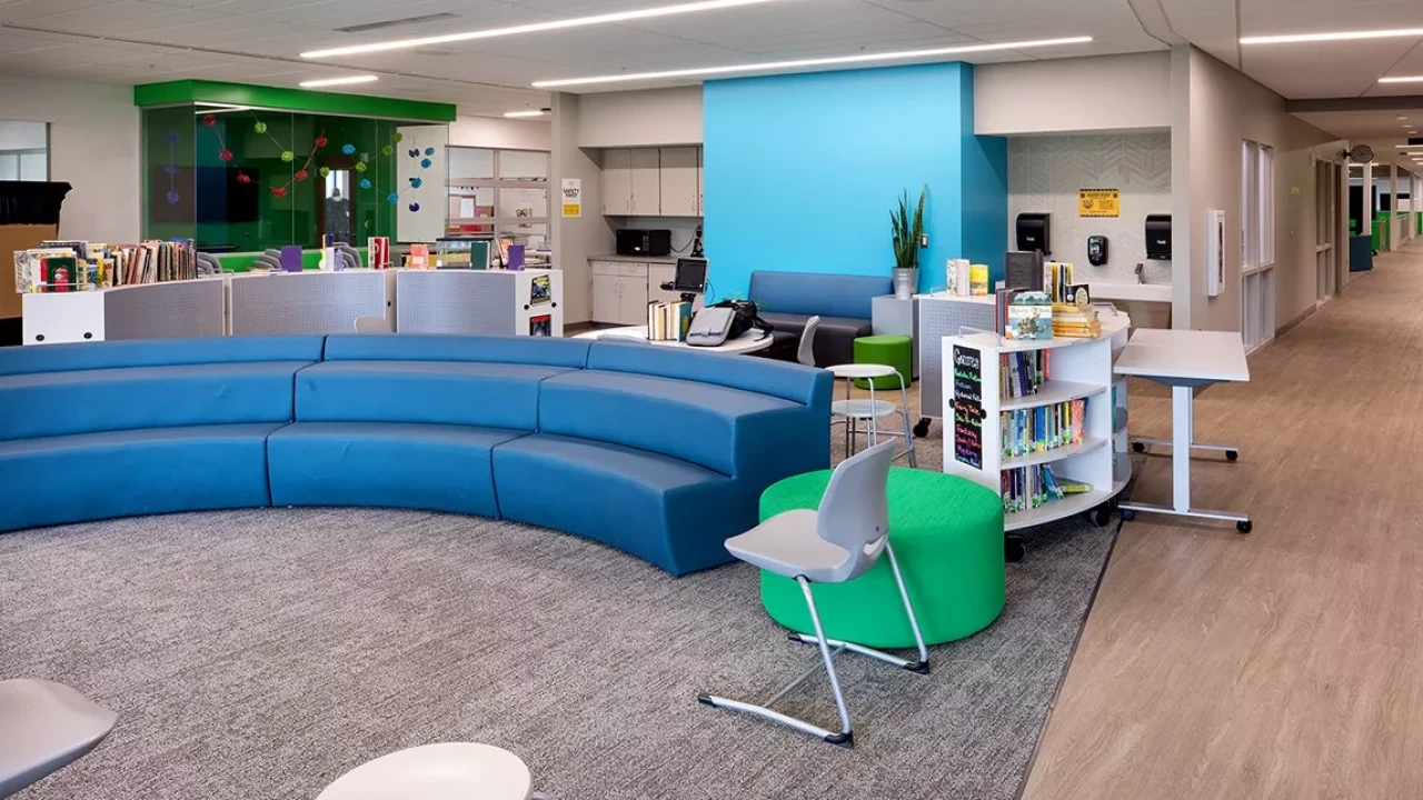 Each classroom features overhead doors, allowing students the ability to collaborate inside, or in environments beyond the classroom itself. Group study rooms are shared between classrooms, providing the look and feel of more focused environments. The open-concept media center features large learning stairs that will serve multiple purposes: a collaborative learning space, demonstration space, and study space.